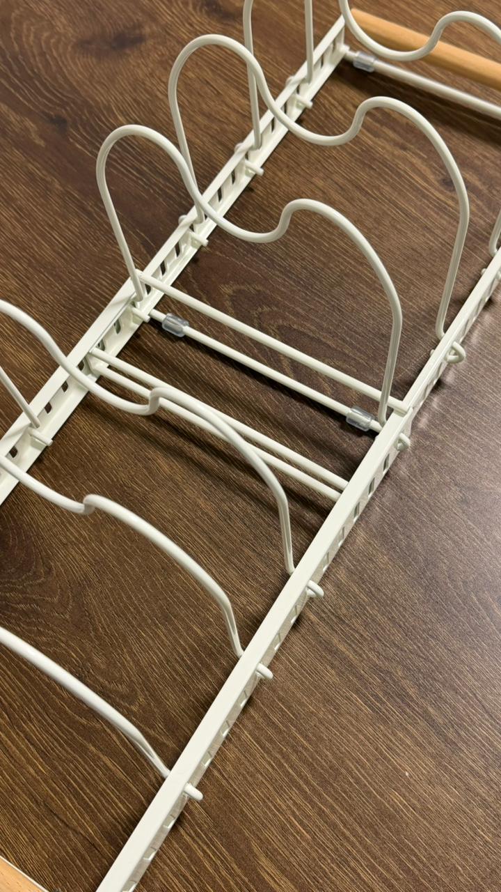 A practical organizer designed to neatly store pans, pot lids, plates, and cutting boards on your kitchen countertop or inside cabinets.